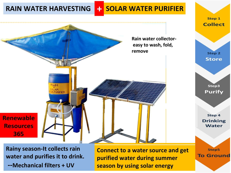 - Rainwater Harvesting + Solar Water Purifier